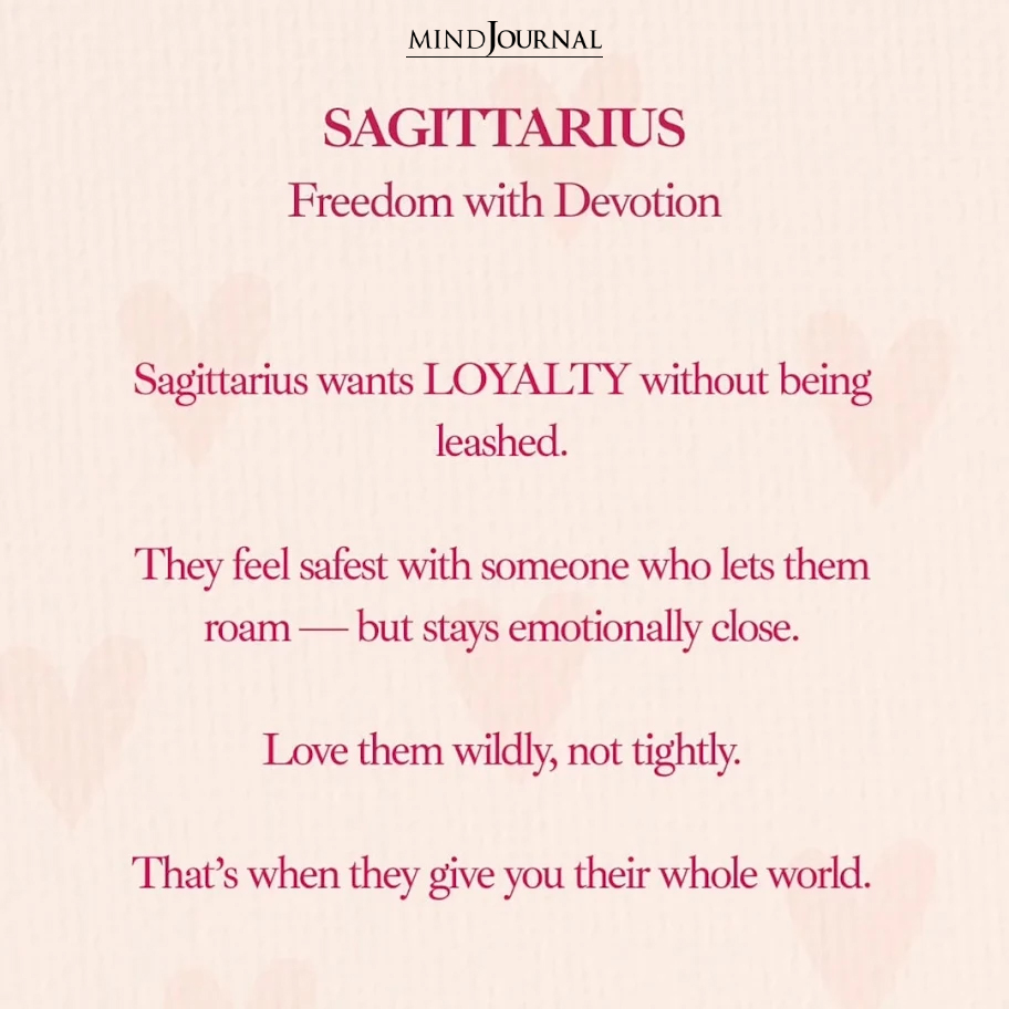 Sagittarius is secure in love when freedom and loyalty are together. Their emotional needs are someone who allows them to wander while remaining emotionally intimate. Their vulnerable side gleams when love is free and never possessive. Trust without strings is their safety, and that is when they give themselves fully.