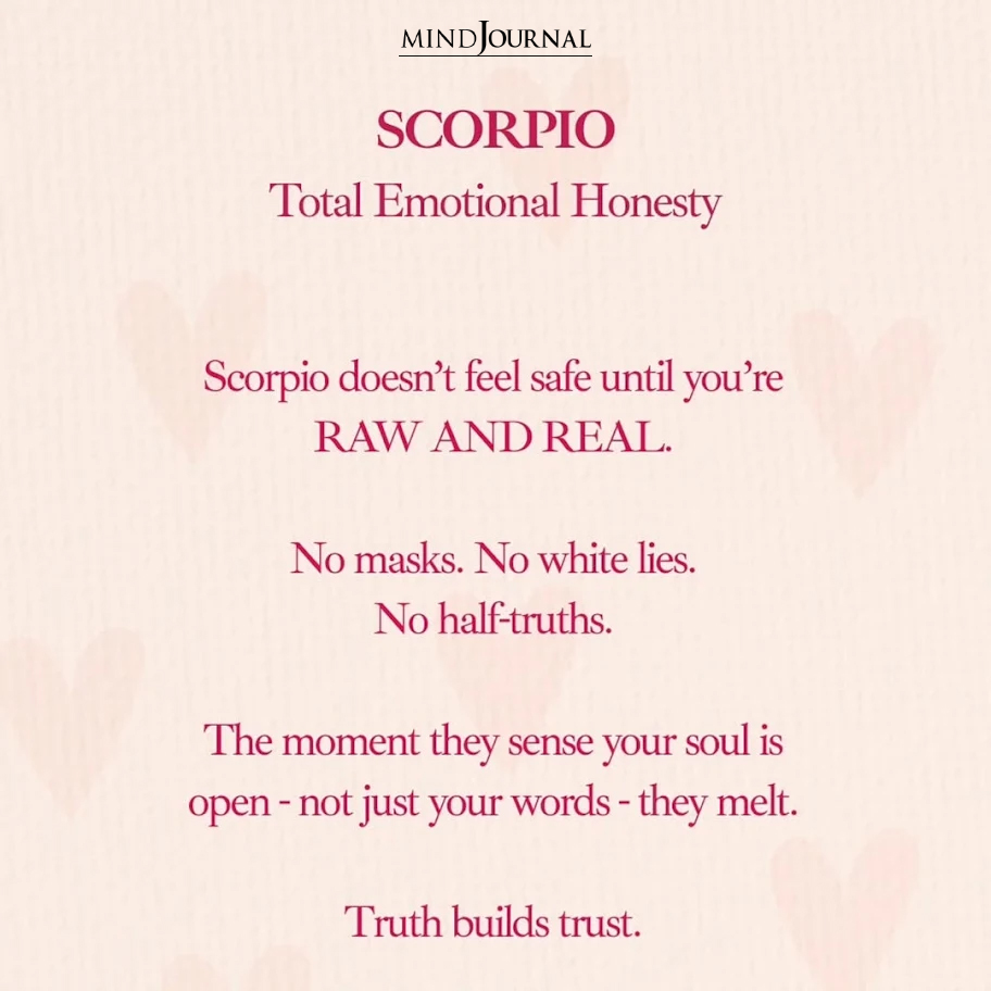 Scorpios have emotional needs that are deeply rooted in the importance of truth when it comes to love and security. They will not settle for half-truths or masks and require raw truth in order to trust. Their vulnerable side comes out when they feel transparency of expression and act. When Scorpio believes that their partner’s soul is exposed, they soften and let their most profound vulnerability come out.