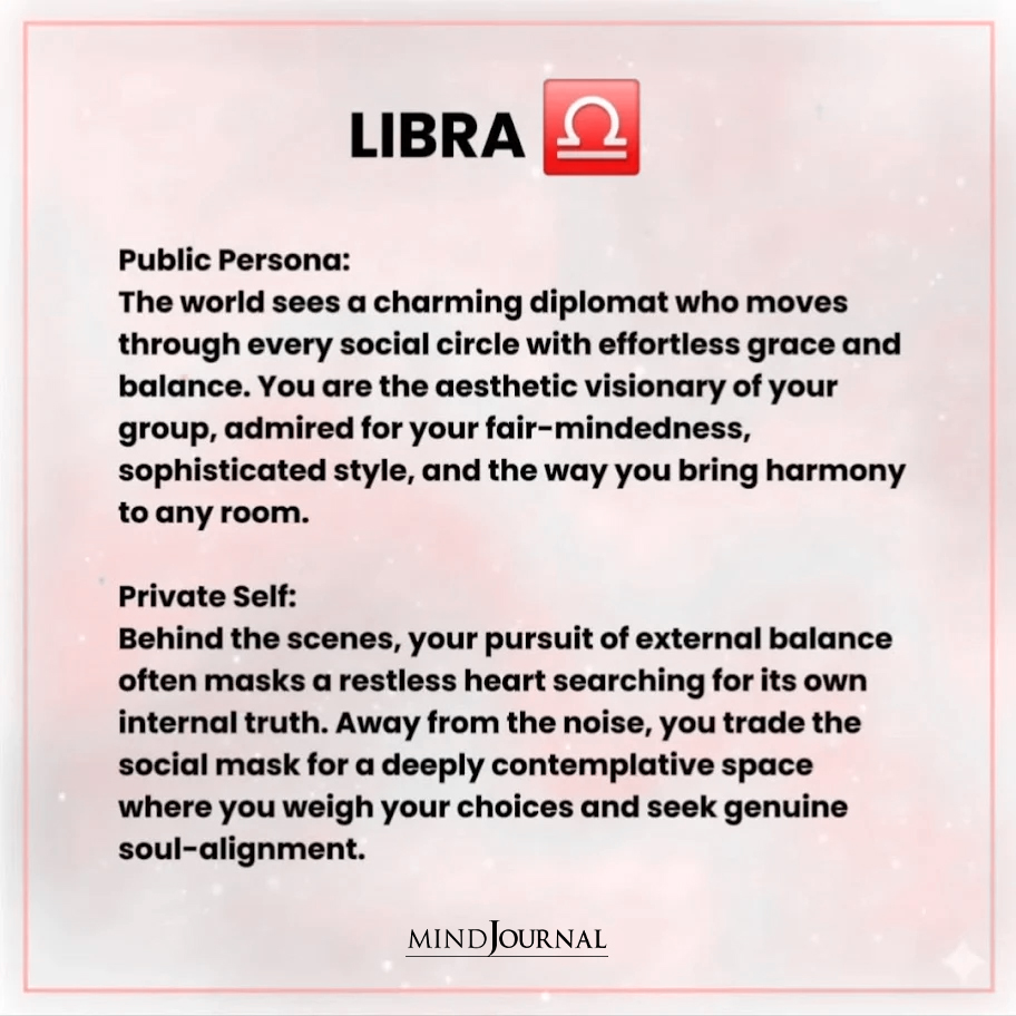 In private, you deal with a lot of inner restlessness and questioning. Behind that polished image is someone searching for what really feels true to them. You spend time overthinking decisions, your values, and whether your life actually aligns with who you are inside. Away from what everyone expects of you, you’re looking for clarity, authenticity, and a deeper understanding of yourself.
