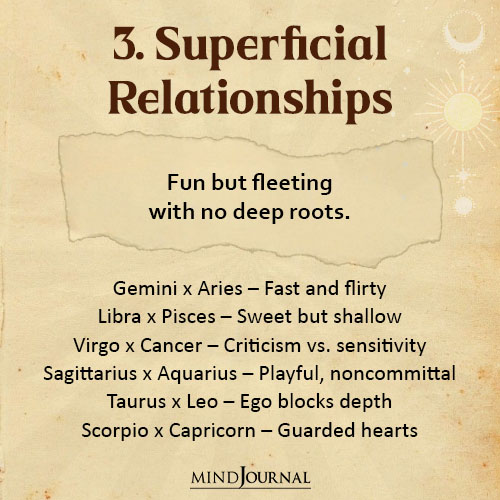 Fun, exciting, but lacking in depth. These zodiac couples enjoy each other but rarely build long-term foundations.