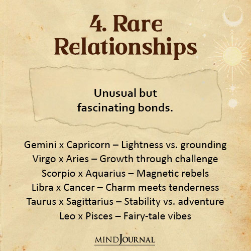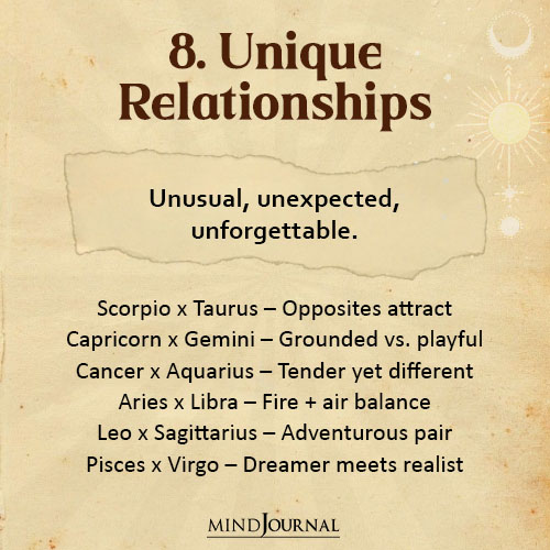 When it comes to zodiac relationships chart, these couples often defy expectations and prove others wrong. They’re unusual, but beautiful.