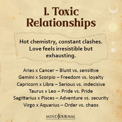 These are the zodiac couples that burn hot but also burn out quickly. Their attraction is real, but the constant clashes make it exhausting for the relationship to thrive.