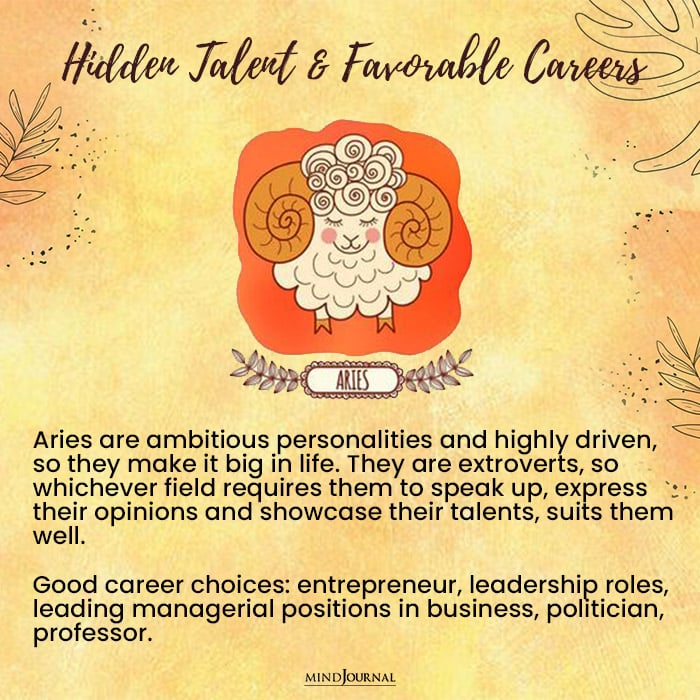 Aries are ambitious personalities and highly driven, so they make it big in life. They are extroverts, so whichever field requires them to speak up, express their opinions and showcase their talents, suits them well.
