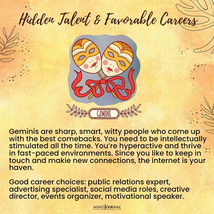 Geminis are sharp, smart, witty people who come up with the best comebacks. You need to be intellectually stimulated all the time. You’re hyperactive and thrive in fast-paced environments. Boring, humdrum office jobs are your biggest nightmares.