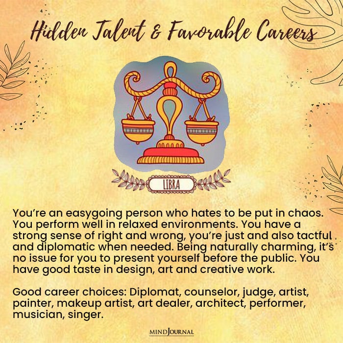 According to Libra hidden talents, you would hate to be limited to a common cubicle job and like being in the limelight sometimes. Being naturally charming, it’s no issue for you to present yourself before the public eye. Venus being your ruling planet, you have a deep appreciation for good aesthetics.