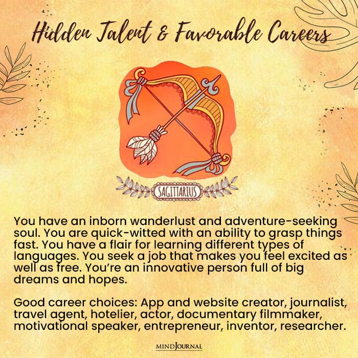 You have a flair for learning different types of languages and journaling your life experiences. As per ideal jobs for a Sagittarius, you seek a job that makes you feel excited as well as free. 9-5 desk jobs aren’t really your thing. You’re an innovative person full of big dreams and hopes.