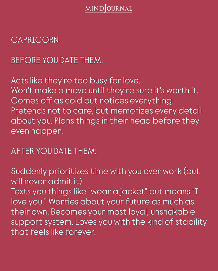 Capricorn always seems way too busy with work to think about dating. They won’t make the first move unless they’re absolutely sure you’re worth their time. They come across as calm and sometimes even cold, but they’re watching and noticing everything about you. They act like they couldn’t care less, but secretly they’re remembering all the little details you mention. Capricorns are already planning a future with you in their head long before they show any actual feelings.