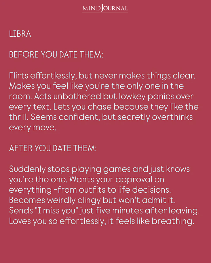Libra flirts like an artistโsmooth and charming, but they never make it totally clear where things stand. They have this gift for making you feel like you’re the only person who matters when you’re together. They look so chill and easygoing, but secretly they’re freaking out about every single text they send you. Libra loves being chased a little because the excitement of it all feels fun to them. They come across super confident, but inside their head they’re overthinking every tiny thing about you and them.