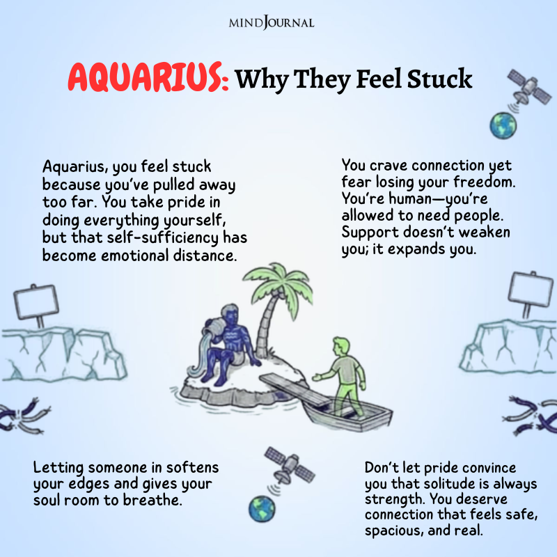 Feeling stuck in life for Aquarius is relational at its core. Because they see patterns others cannot see and care about things others find abstract, the connection becomes complicated. This makes them withdraw because it feels easier than explaining themselves. Aquarius doesn’t need to change who they are. But they do need to let people in, even if it feels uncomfortable.