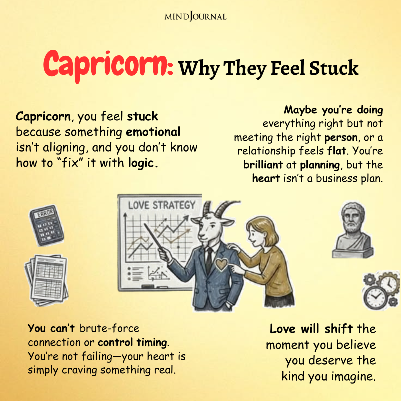 Feeling stuck as a Capricorn looks like fixing emotions with logic, leaving them with a life that’s successful but empty. A Capricorn’s lesson is to question their own rules. Sometimes, the most logical choice is the one that doesn’t make sense on paper but feels right in the heart.