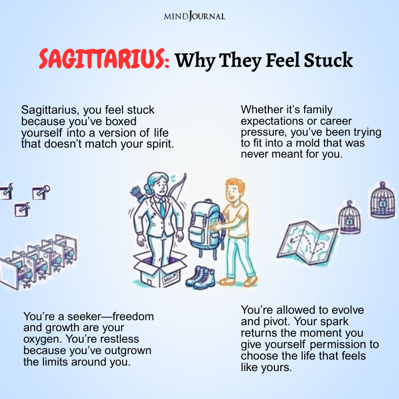 A Sagittarius is meant to expand, evolve, and explore. They feel stuck when people around them try to fit them in their usual box of expectations: a career track, a five-year plan, a pre-defined version of success.