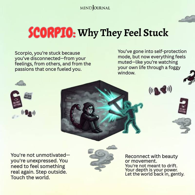 When discussing zodiac signs feeling stuck, Scorpio’s version is among the most layered. They crave growth but often get lost in the intensity of their own inner world. The lesson to remember here is that clarity comes not from uncovering more, but from allowing things to settle.