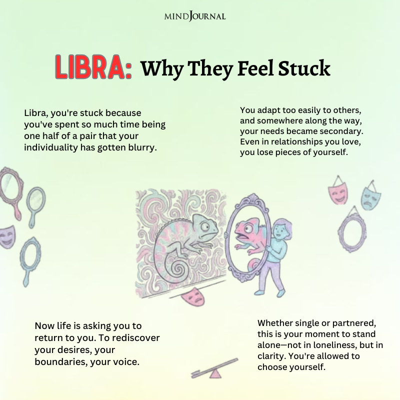 Libra sees every side. Every perspective. Every possible outcome. Feeling stuck for Libra is essentially a loop of infinite consideration, every option examined until none of them feels right anymore. They weigh options endlessly, trying to find balance, trying to avoid regret. But in doing so, they stand at the crossroads forever.