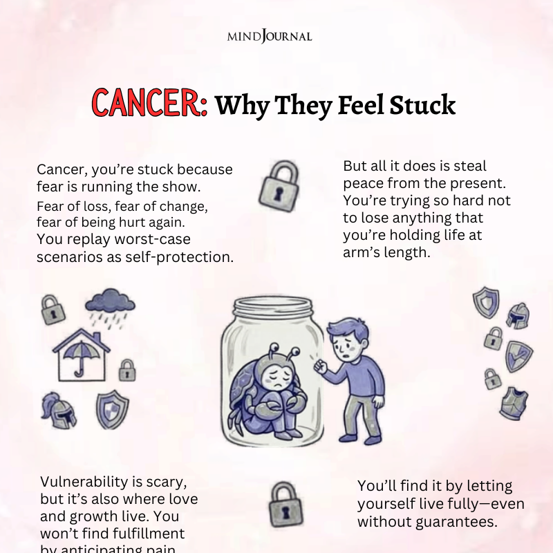Cancer feels everything deeply, which is both a superpower and the reason behind their feeling stuck. They build emotional worlds that feel safe, meaningful, and deeply personal. But the more they invest, the harder it becomes to leave, even when they know they should.