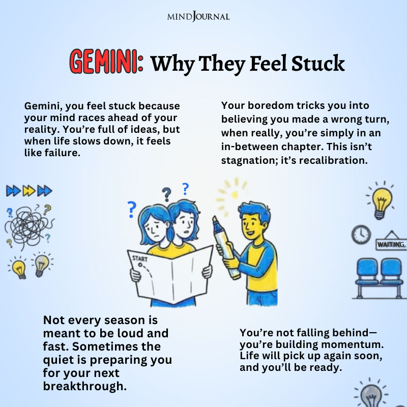 And this creates a constant loop of restlessness. They start something, lose interest, move on, and then feel stuck because nothing feels complete. Feeling stuck because of too many options, not too few, is a Gemini speciality. The real challenge for them is learning to stay with something long enough to see it evolve.