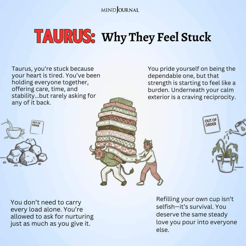 Taurus is strong, reliable, and grounded. But that strength can often become a burden. They feel stuck, not because they lack drive, but because they’ve quietly taken on everyone else’s burdens and have no idea how to put them down. So they stay, even when they’ve outgrown a situation.