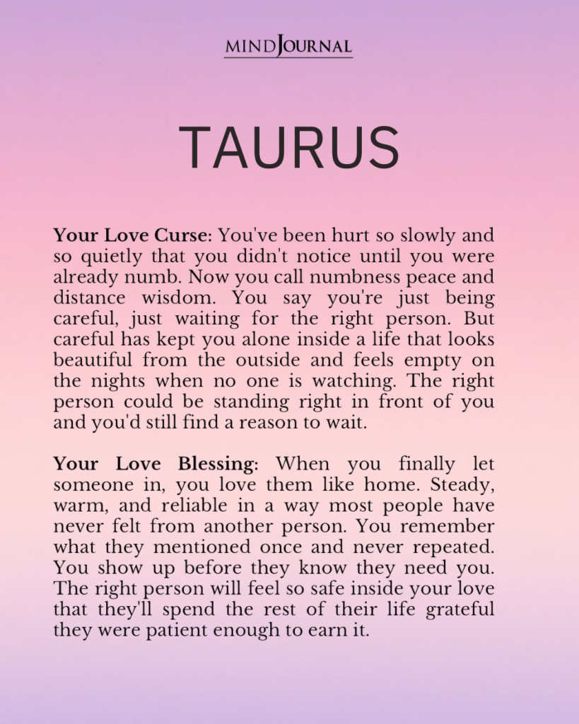 The Taurus love curse is stubbornness dressed up as devotion. They love stability so much that they may cling to relationships long after they’ve stopped growing. On the flip side, if they’re single, they find a reason to wait even if the right person is standing right in front of them.