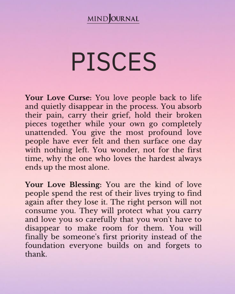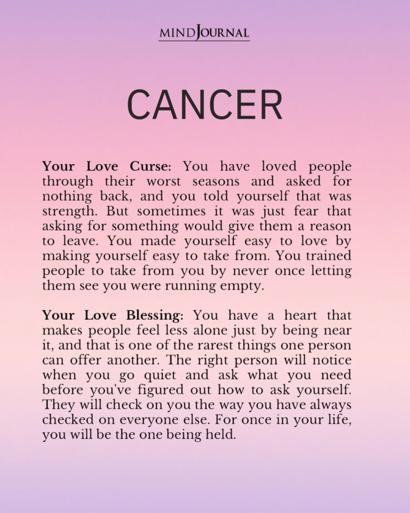 Cancer opens their heart like a floodgate. Their love curse is getting emotionally attached before they truly know if the other person deserves it, which can lead to heartbreak. They love people even in their worst seasons, but never ask anything in return. Your sensitivity, though beautiful, can leave you emotionally exhausted.