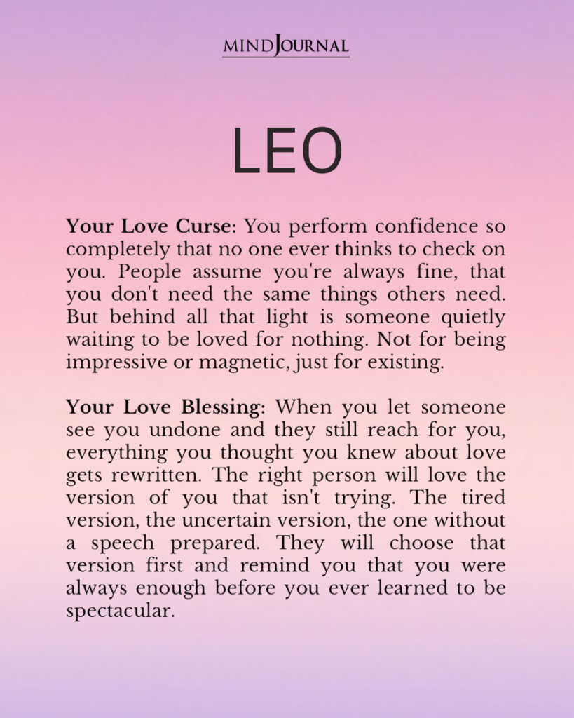 Among all zodiac signs and their curses, Leo’s is perhaps the most surprising. It’s weird, but a Leo’s confidence becomes their biggest love curse. Because of their confident persona, people often assume them to be always fine. But behind all their magnetism and charm, they are quietly waiting to be loved for nothing.