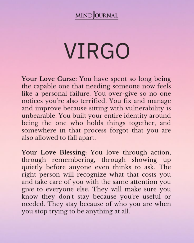 Virgo’s analytical nature doesn’t switch off in relationships. They see potential in people so clearly that they accidentally sign up to fix them. They over-edit their own feelings, their partner’s flaws, and the relationship itself. Moreover, they rely so much on themselves; being in a relationship feels like a personal failure.