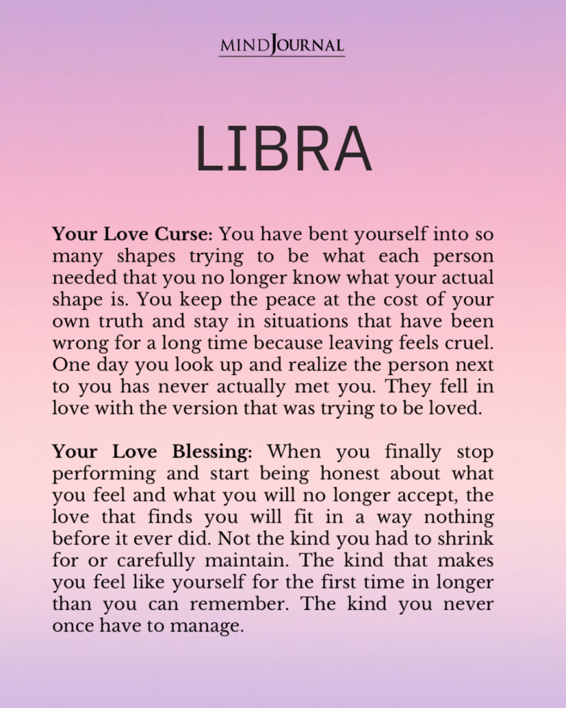 They are so terrified of conflict that they say yes even when they mean no, avoid hard conversations, and people-please their way into resentment. The love life of zodiac signs ruled by Venus is supposed to be beautiful but Libra’s love curse is maintaining harmony at the cost of their own truth.