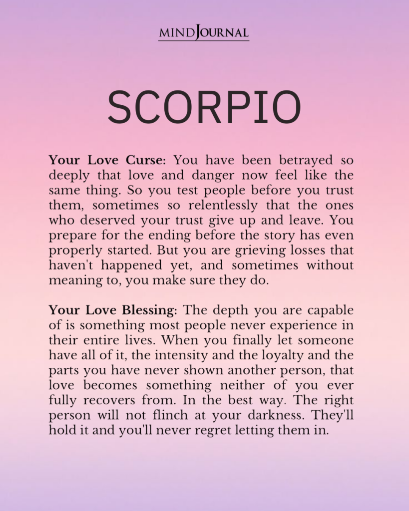 Scorpios feel everything intensely, but their fear of betrayal makes them guarded. They test a person ten times before letting them in, so relentlessly that even those who deserve their trust give up and leave. Their high self-protective walls are their love curse, making them end the story even before it starts.