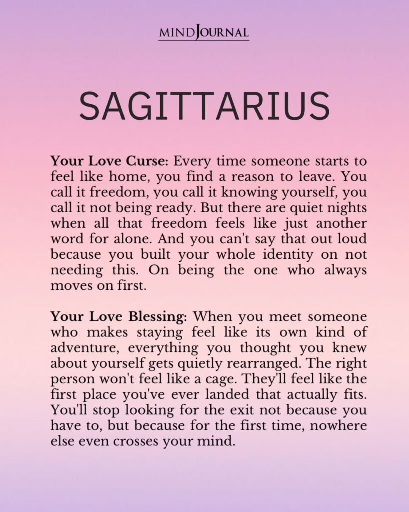 Sagittarius craves adventure and independence, which can make commitment feel like a limitation rather than a choice. They think of commitment as a cage and panic at the thought of it. They fall in love with people and then ghost the idea of forever, not because they don’t care, but because forever sounds suspiciously like a trap.