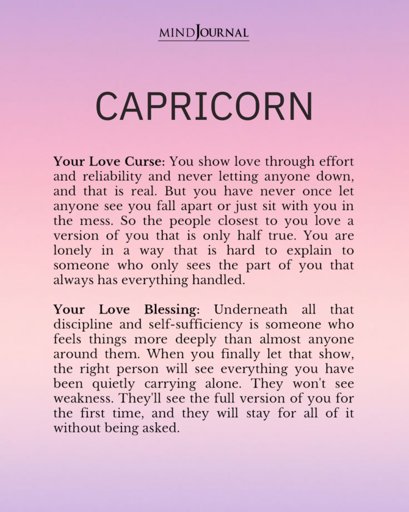 Capricorns can get so focused on success and stability that they unintentionally neglect emotional intimacy in relationships. They never let anyone see them fall apart because all they have learned is how to handle responsibilities. Their love curse is vulnerability which feels like a risk they haven’t budgeted for.