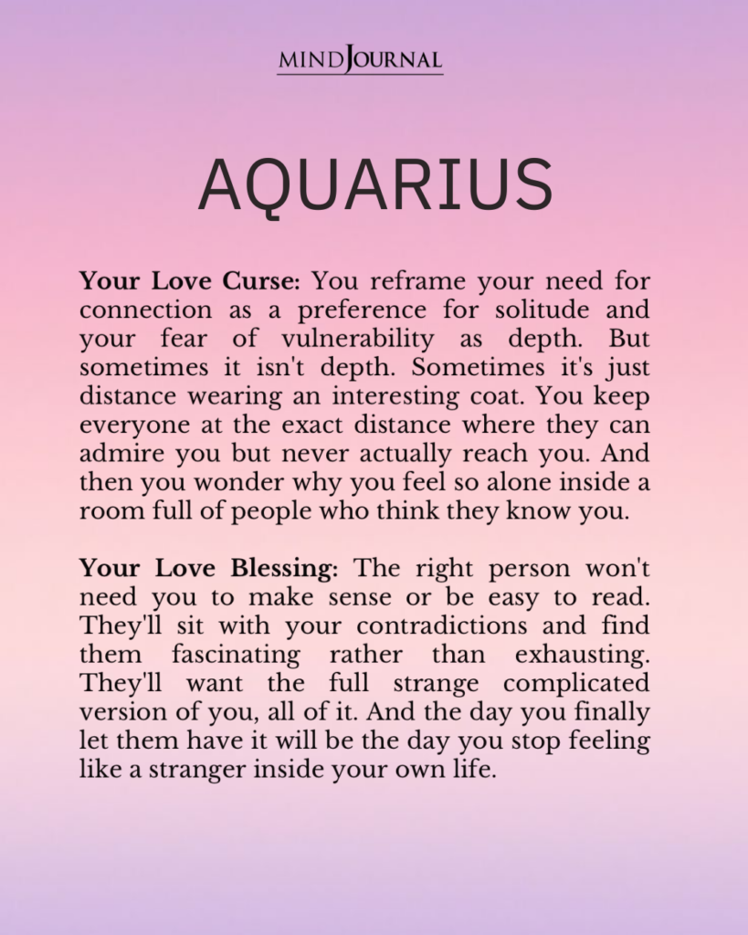 Aquarius lives in their mind more than their heart, which can make them seem distant or hard to read in relationships. They keep people just at the right distance so as not to reveal their true selves completely. Their love curse is emotional detachment, a tendency to intellectualise feelings instead of actually sitting with them. When we chart the love life of zodiac signs, Aquarius is the one that makes partners feel like they’re dating a brilliantly interesting stranger .