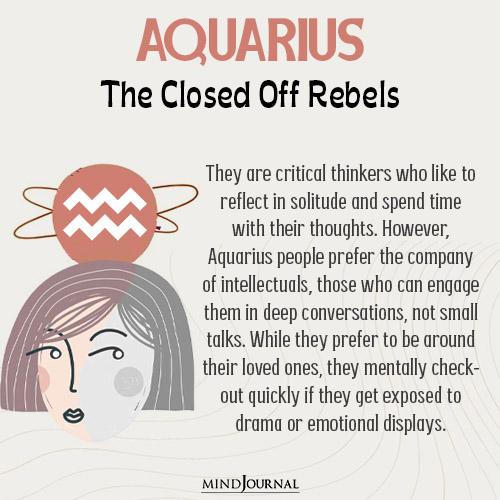 They come out of their shells in the company of like-minded people who discuss ideas, not other people. Aquarius natives are known for being emotionally closed-off as well. While they prefer to be around their loved ones, they mentally check-out quickly if they get exposed to drama or emotional displays.