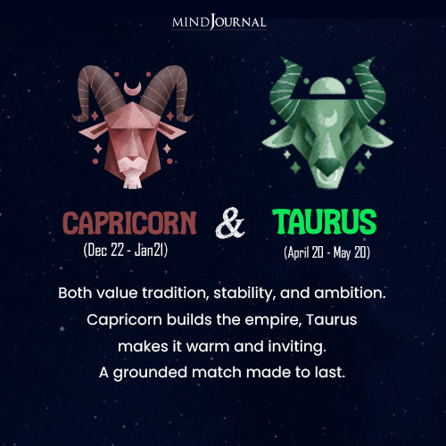 Capricorn shares Taurusโ drive to build a strong foundation for the future. They both can build an empire together. Capricorns are highly ambitious and make good managers, leaders, and bosses. They can give Taurus the finer things in life which Taurus appreciates very much.