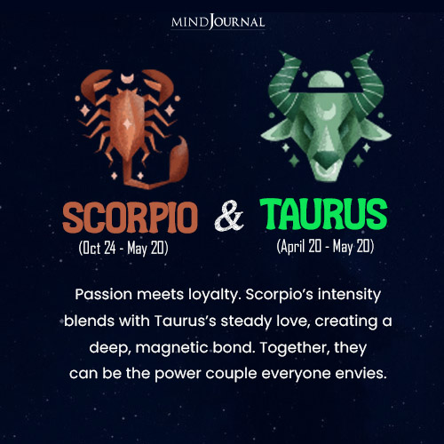 Scorpio is intense, passionate, and fiercely loyal. This appeals to the sensual and commitment – focused Taurus.