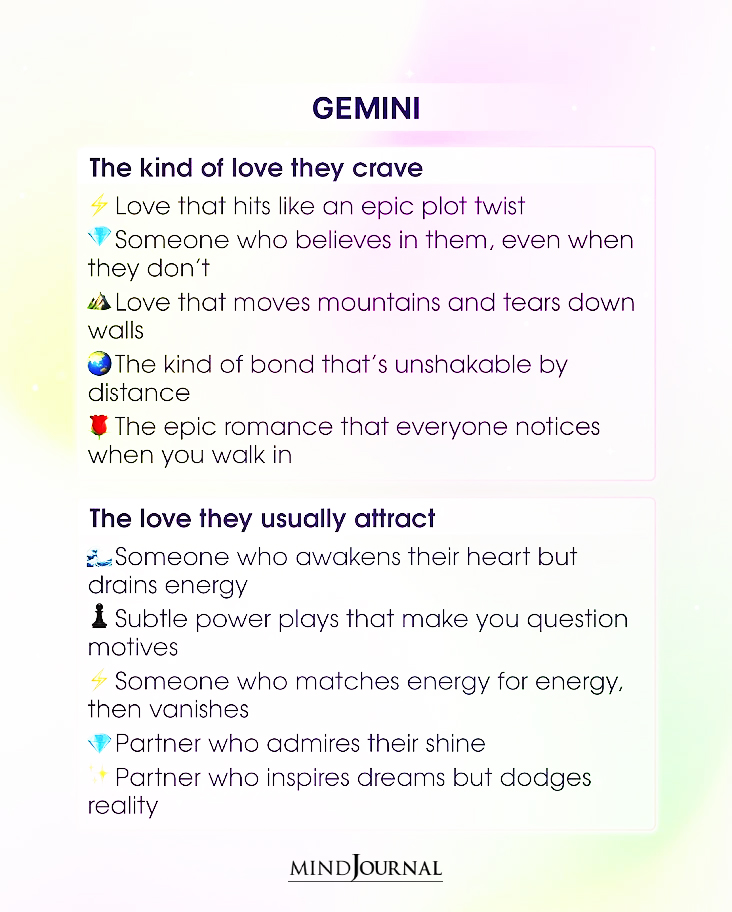 - A love that is an epic plot twist, surprising and enchanting in all possible ways. Gemini is looking for a relationship that keeps them guessing while remaining full of wonder and happiness.